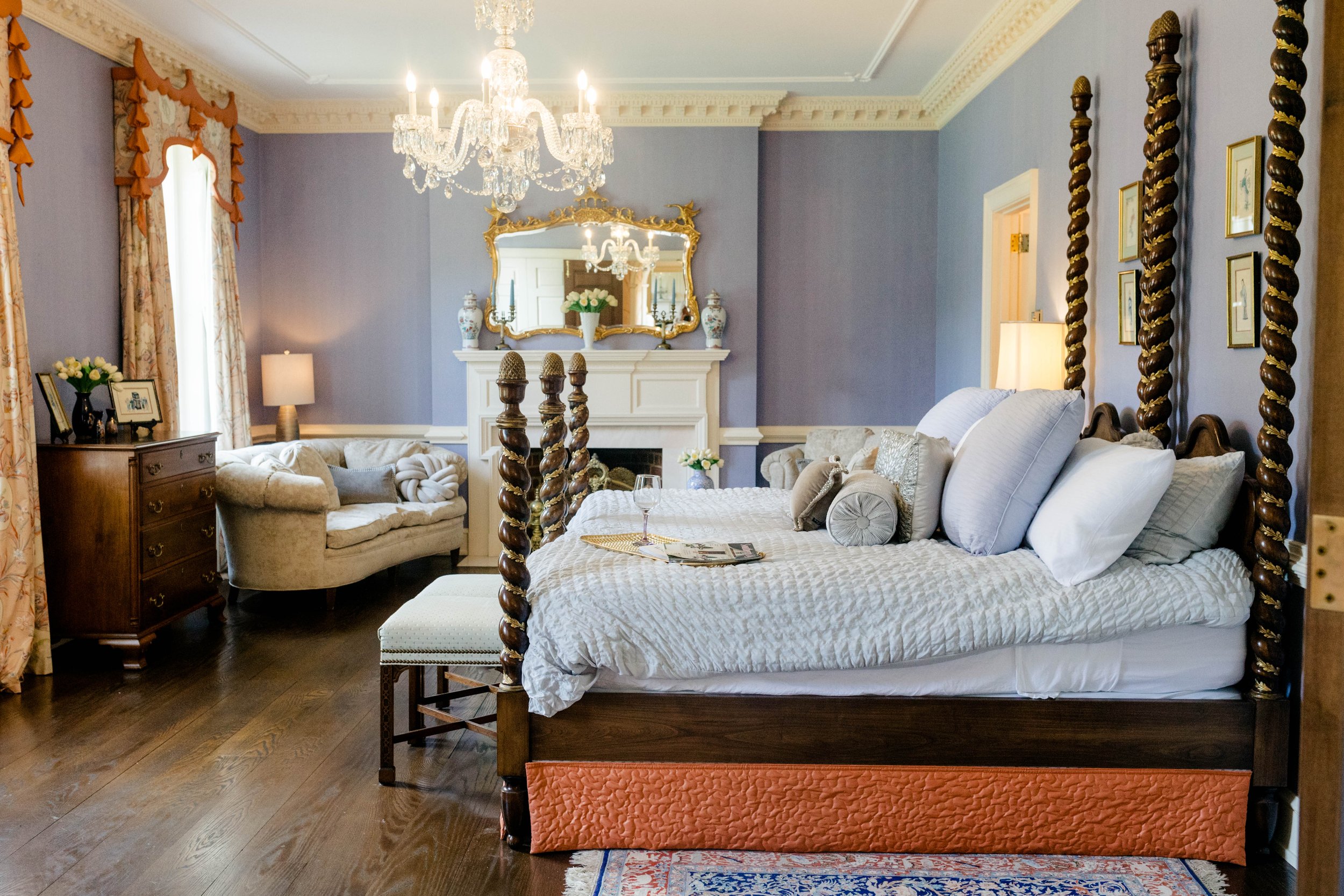 Artfully designed with Asian antiques and soft lavender tones, this suite offers a serene and sophisticated setting. With an ensuite bath and vintage gold fixtures, it’s ideal for overnight guests or quiet preparation before the day begins.