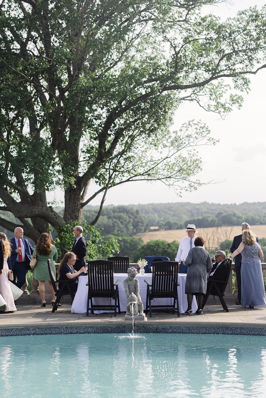 Group of people gathering outdoors near a swimming pool with a large tree and scenic countryside in the background.