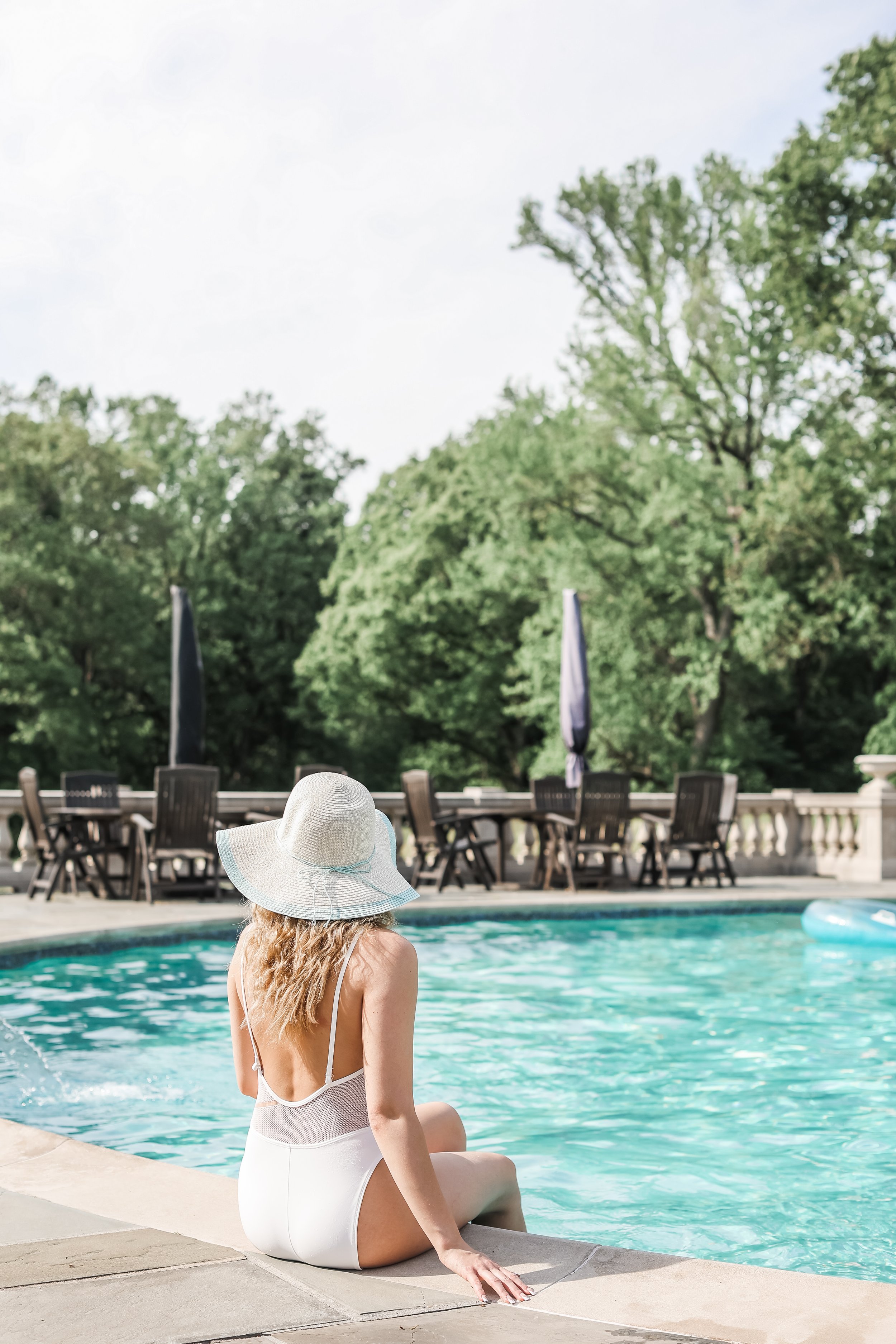 Woman in a white swimsuit and wide-brimmed sun hat sitting on the edge of a swimming pool, facing away, with a backyard patio with chairs and umbrellas in the background, lush green trees surrounding the area.